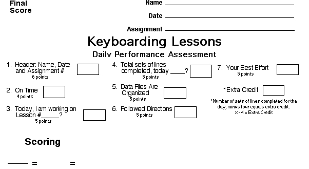 Keep progress on a chart that students can mark as they complete their lessons. Use student lesson books (see Course Materials) to record and document student progress. This is done by marking off lines with a highlighter upon review at the student’s workstation. Develop a system for monitoring daily progress. See rubric: Keyboarding Skills - Daily Performance Assessment. Download printable PDF copy of rubric.
